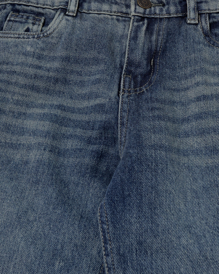A classic mid wash denim and straight fit make these jeans the definition of casual cool. -Denim -Front Scoop Pocket -Coin Pocket -Back Patch Pocket -Adjustable Waist -Branded Button -Straight Fit -Machine Wash Cold