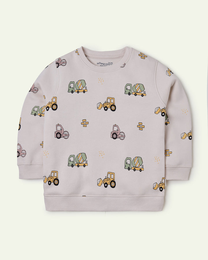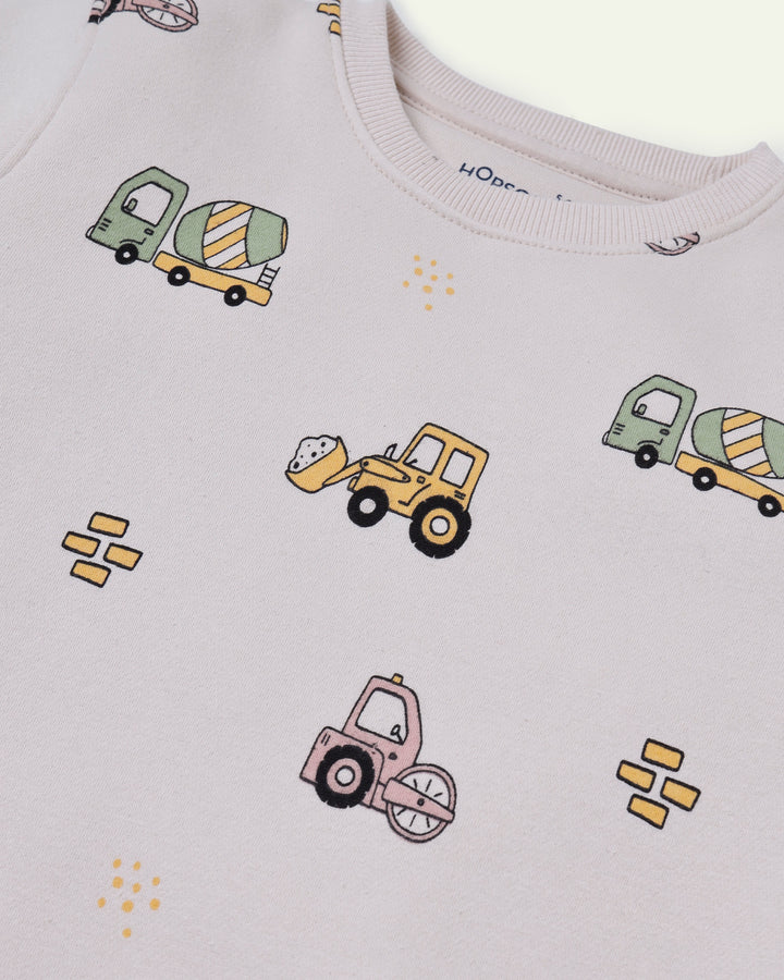 A cozy beige sweatshirt featuring playful construction vehicle graphics for little builders in the making. -Fleece -Ribbed Neckline -Machine Wash Cold