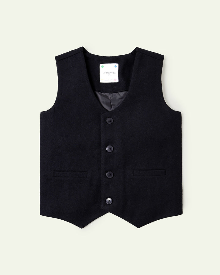 A sleek black vest with yellow detailing that brings a little gentleman’s flair to your kid’s wardrobe. -Wool -DTM Lining -Contrast Piping & Stitch -DTM Branded Buttons -Dry Clean