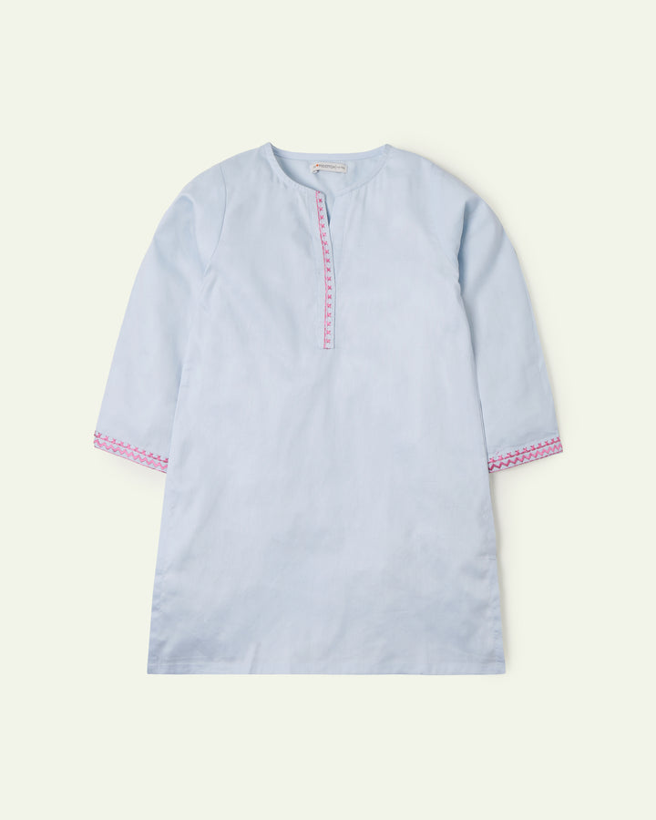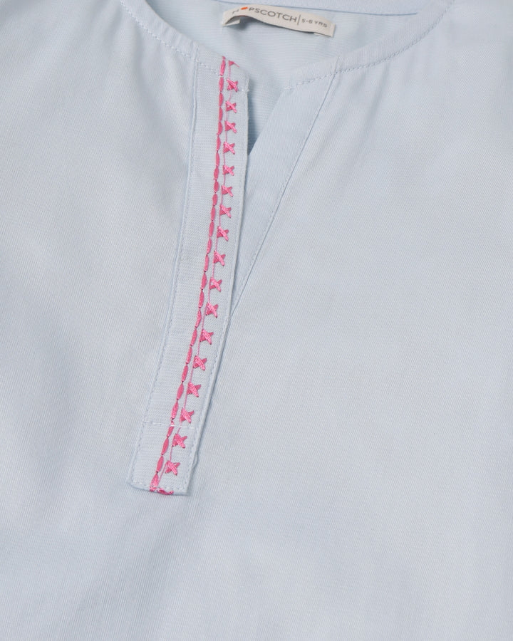 Delicate embroidery meets effortless style in this chic ice blue tunic with contrasting stitch tunic for young girls. -Cotton -Embroidered -Machine Wash Cold