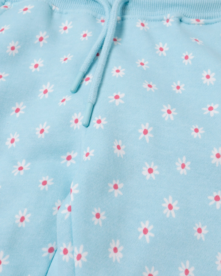 Soft fabric and a relaxed fit make these light blue jogger pants with flowers printed all over for a go-to for kids on the move. -Fleece -Cross Pockets -Elastic Waist -Drawstrings -Back Patch Pocket -Machine Wash Cold
