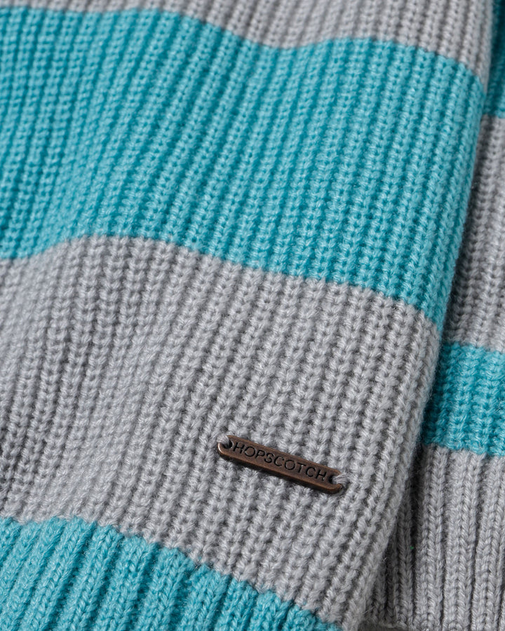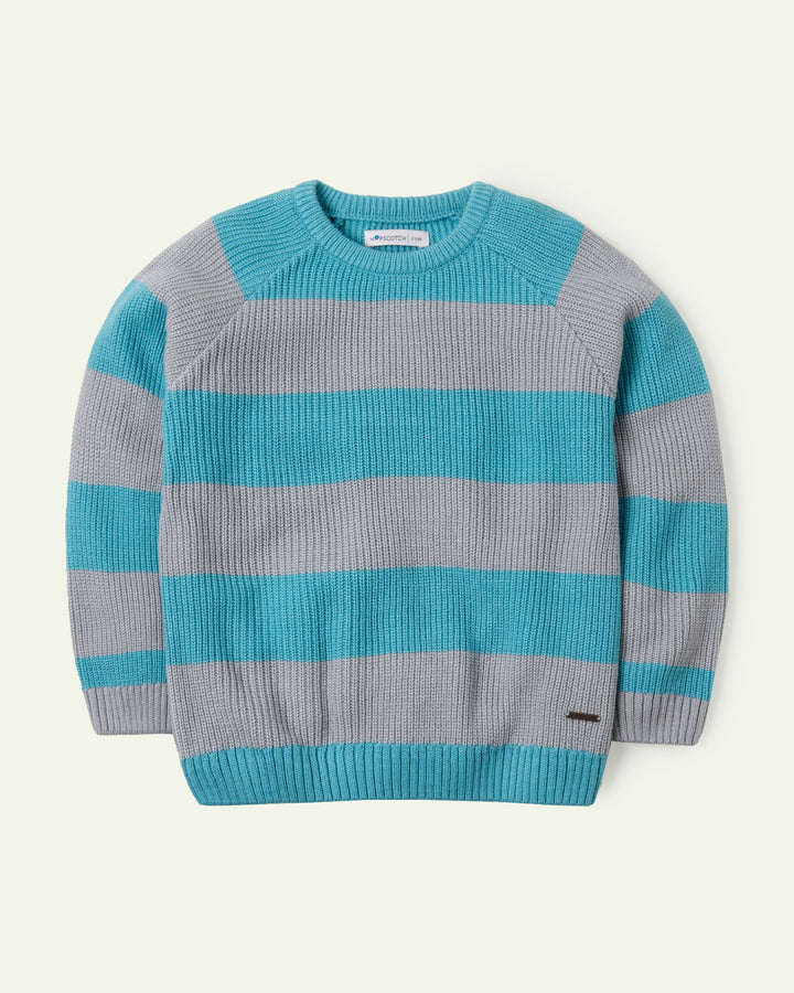 A raglan sleeve toned sweater with grey and blue stripes that blend style with comfort. -Acrylic -Crew Neck -Metal Trim Badge -Raglan Sleeves -Machine Wash Cold