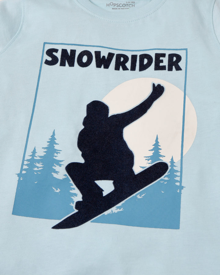 This blue Snow Rider T-shirt with applique accents adds a playful, adventurous vibe to your kid’s winter wardrobe. -Cotton -Puff Print -Machine Wash Cold