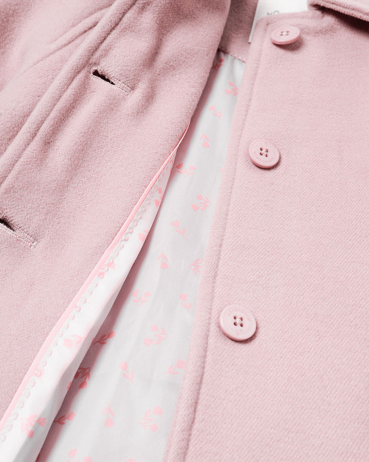 Keep her cozy and stylish in this soft blush pink coat featuring classic raglan sleeves. -Wool -Cross Flap Pockets –Front Placket Opening -DTM Branded Buttons -Raglan Sleeves -Floral Lining -Dry Clean Only