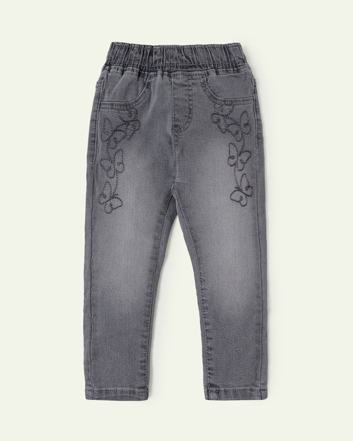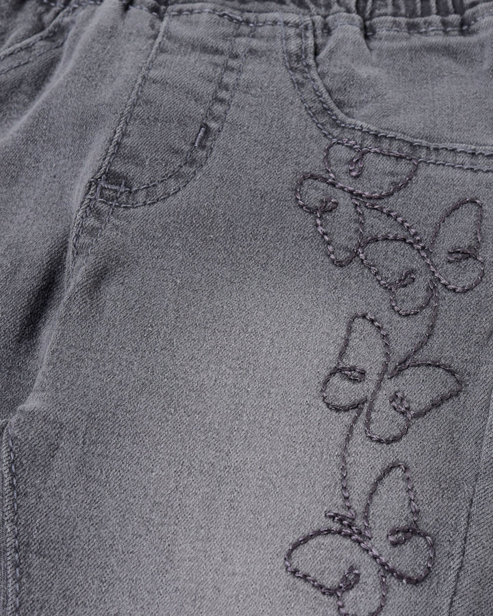 Butterfly embroidery adds a magical touch to these comfy charcoal jeggings for kids. -Denim -Embroidered -Faux Pockets -Machine Wash Cold