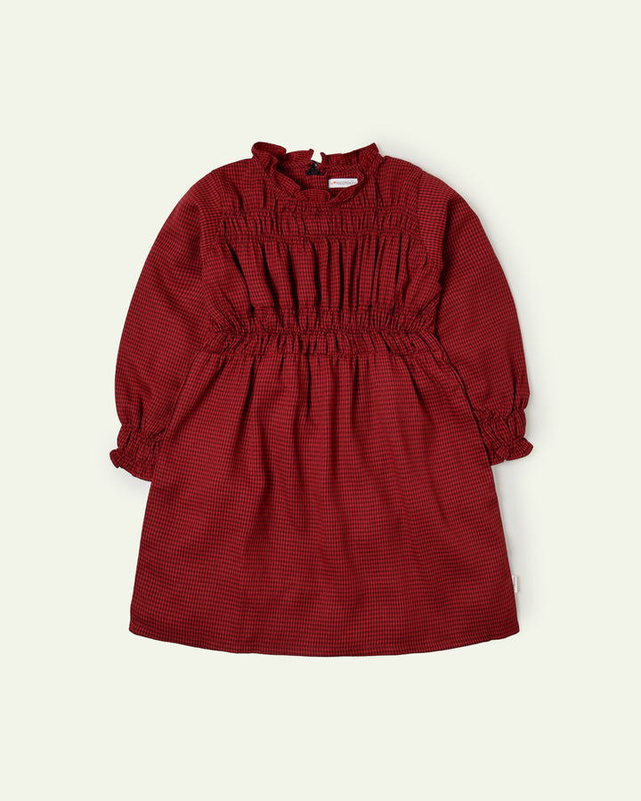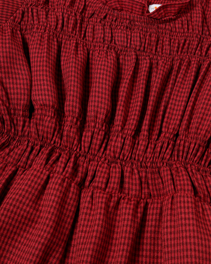 A checkered maroon and black dress with smocked styling and ruffle accents, perfect for a cute and comfy outfit. -Georgette -Smoking Details -Ruffles -Back Zipper -Machine Wash Cold