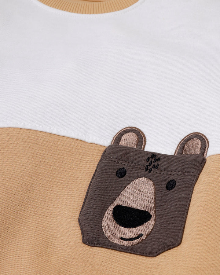 A mix of brown hues and a cute bear embroidered patch pocket make this sweatshirt a lively pick for kids. -Fleece -Ribbed Crew Neck -Cut & Sew -Front Patch Pocket -Embroidered -Applique -Machine Wash Cold