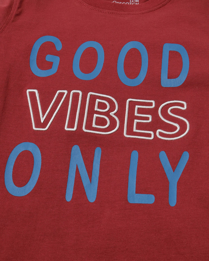 A trendy cut & sew T-shirt in maroon and white featuring embroidered “Good Vibes” for happy days ahead. -Cotton -Cut & Sew -Embroidered -Machine Wash Cold