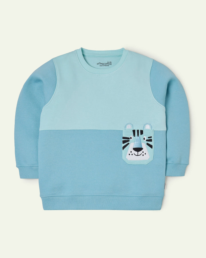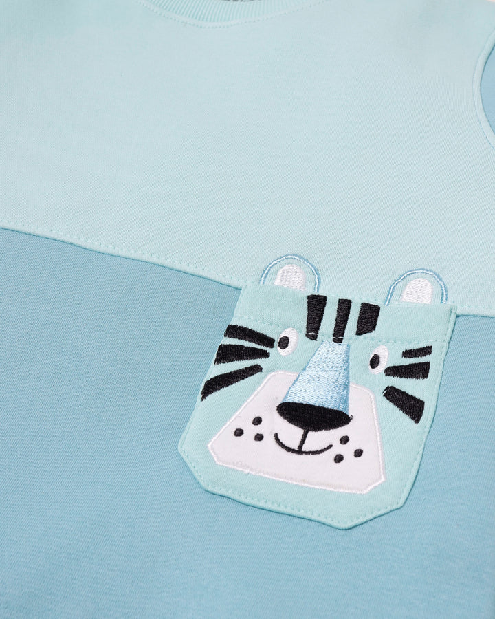 A mix of blue hues and a bold tiger embroidered patch pocket make this sweatshirt a lively pick for kids. -Fleece -Ribbed Crew Neck -Cut & Sew -Front Patch Pocket -Embroidered -Applique -Machine Wash Cold