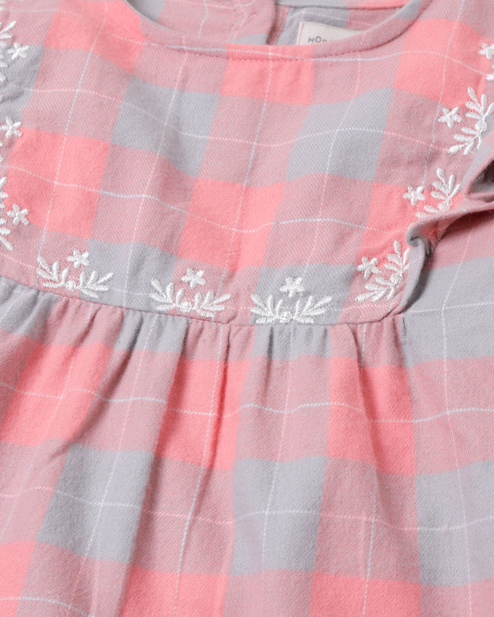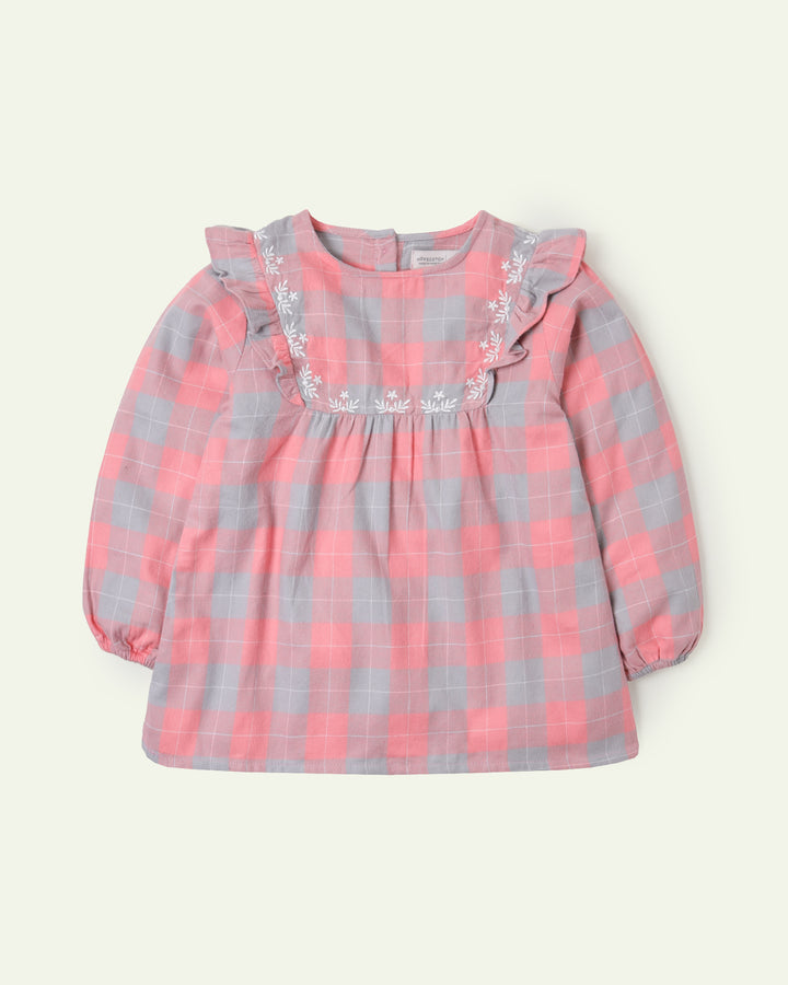 Cozy checks meet delicate embroidery & ruffles for a sweet touch. -Flannel -Embroidered -Ruffles -Elastic Sleeve Hem -Back Half Placket Opening -Machine Wash Cold