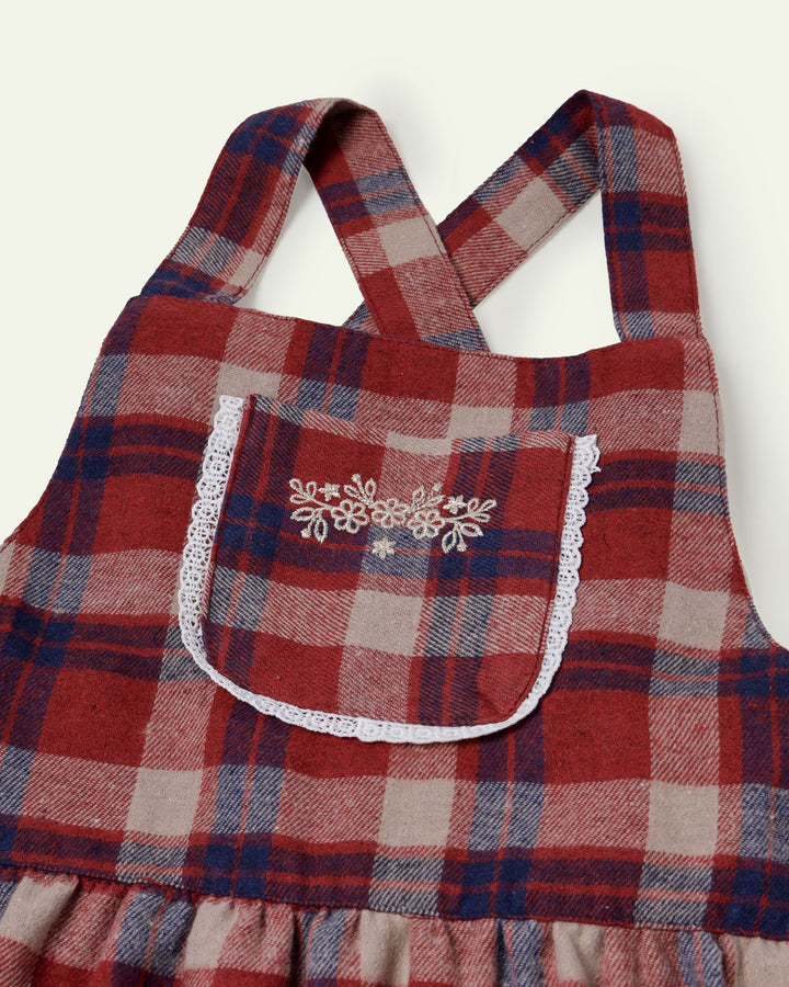 A cozy checkered flannel pinafore dress adorned with delicate embroidery, perfect for chilly winter days. -Checkered Flannel -Front Patch Pocket -Embroidered -Lace Details -Machine Wash Cold