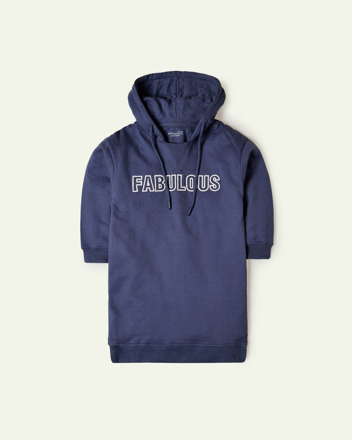 A comfy hoodie dress in soft fleece with ‘fabulous’ stitched front and center. -Fleece -Embroidered -Hood w/ Drawstrings -Machine Wash Cold
