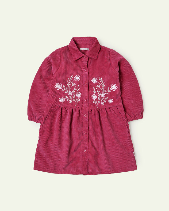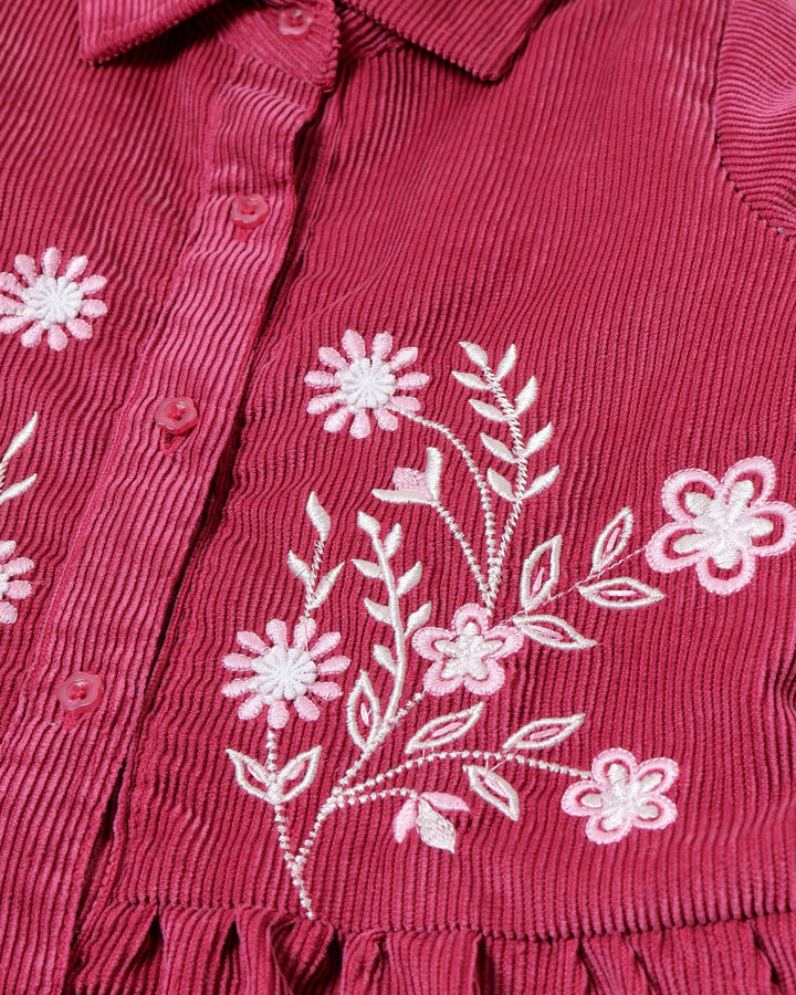 A little vintage charm meets cozy elegance in this burgundy corduroy dress adorned with floral embroidery. -Corduroy -Front Placket Opening -Floral Buttons -Embroidery -3D Flowers -Machine Wash Cold