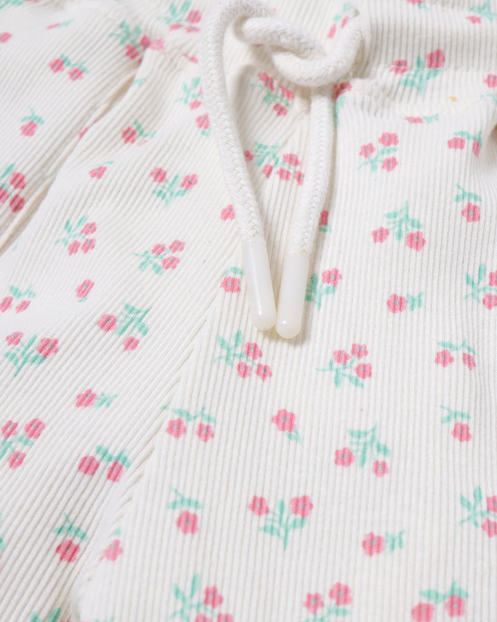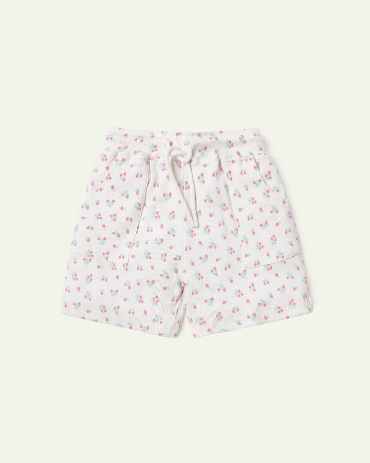 A sprinkle of flowers and a whole lot of comfort these shorts are ready to play. -Ribbed -Elastic Waist -Drawstrings -Patch Pockets -Machine Wash Cold