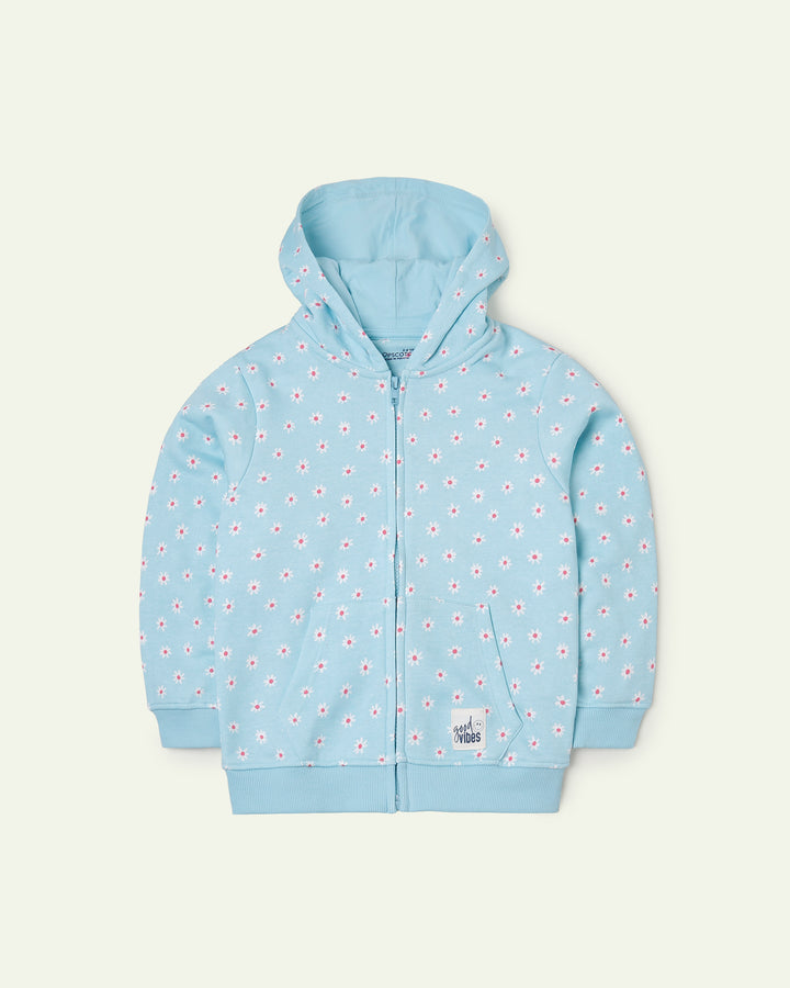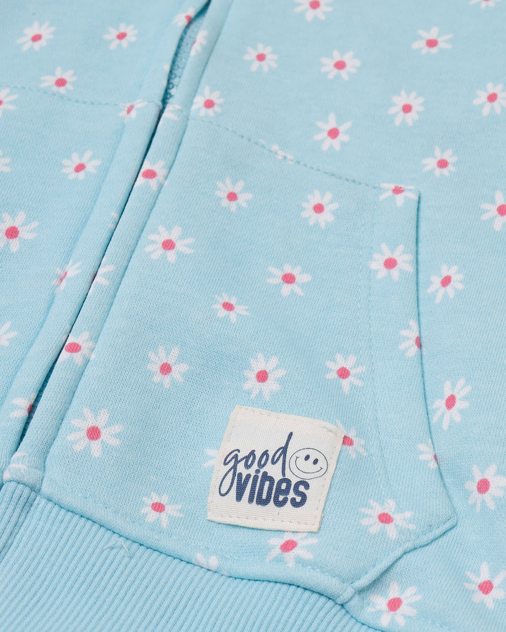 A cosy blue zipper hoodie bursting with colourful flower print that little ones will love to wear. -Fleece -DTM Zipper -Drawstrings -Split Pockets -Twill Patch -Machine Wash Cold
