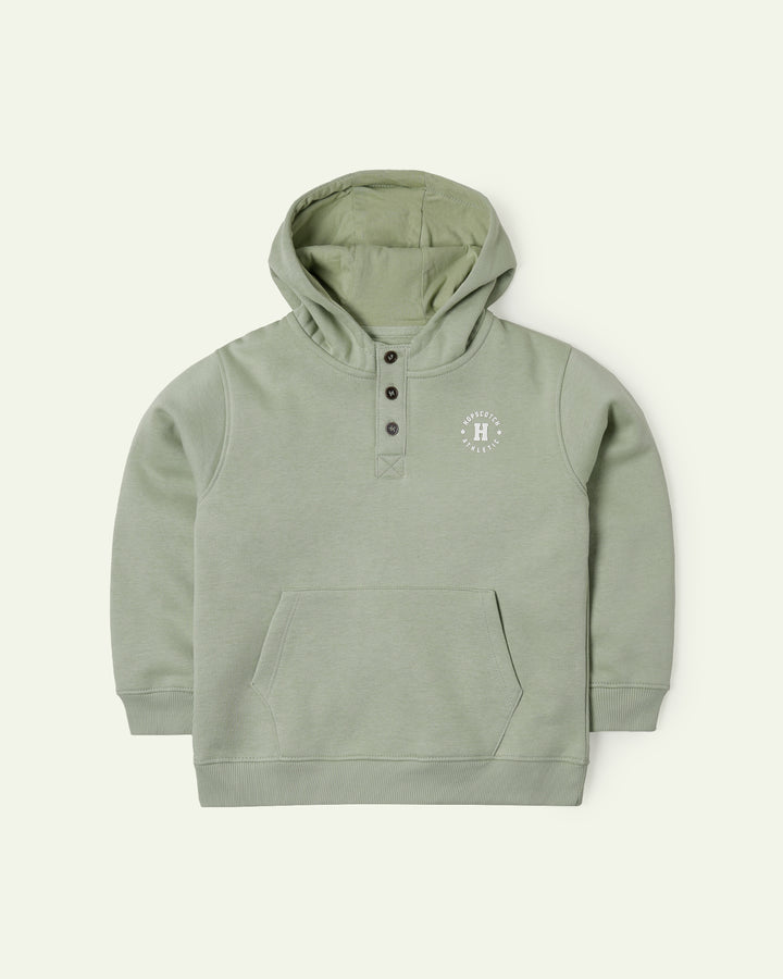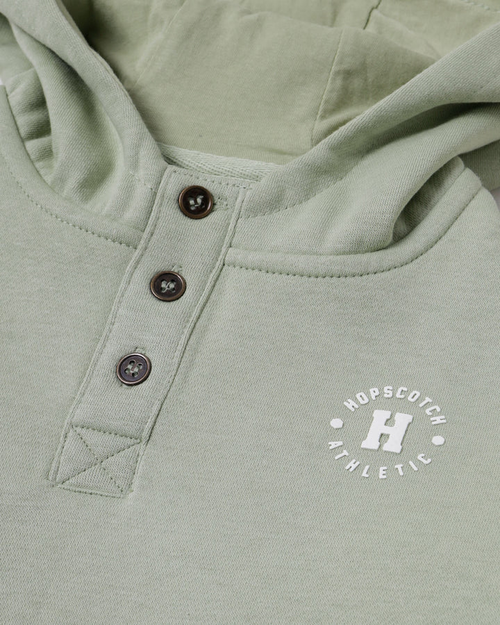 A cozy green hoodie detailed with a crisp HD print, functional front neck opening, and roomy kangaroo pocket. -Fleece -Front Neck Placket Opening -Bronze Buttons -Mock Neck -Kangaroo Pocket -HD Monogram -Machine Wash Cold
