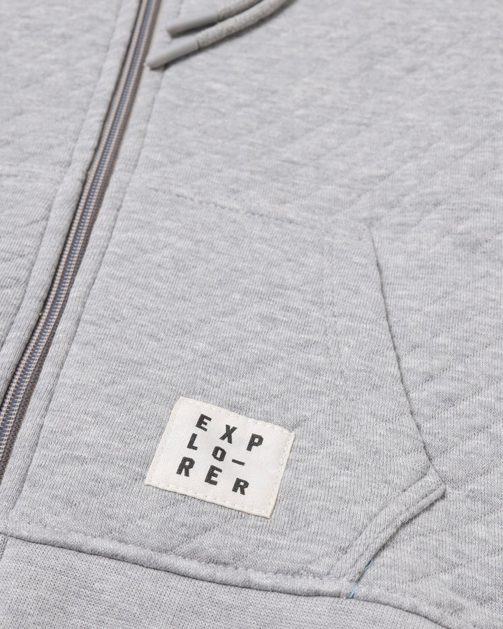 A classic grey quilted hoodie with zipper closure, topped with a small twill patch that says ‘Winter Camp.’ -Fleece -Quilted -DTM Zipper -Hood w/ Drawstrings -Split Pockets -Twill Patch -Machine Wash Cold