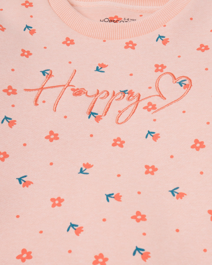 This comfy two-piece set features a peach floral sweatshirt with embroidered detail and cozy joggers. -Fleece -Sweatshirt: Embroidered, Ribbed Neckline -Jogger Pants: Cross Pockets, Elastic Waist, Drawstrings -Machine Wash Cold