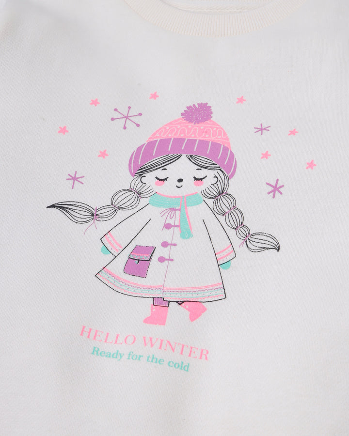 This snug two-piece set pairs an off-white sweatshirt with joggers, detailed with a cute winter doll and seasonal message. -Fleece -Sweatshirt: Ribbed Neckline -Jogger Pants: Cross Pockets, Elastic Waist, Drawstrings -Machine Wash Cold