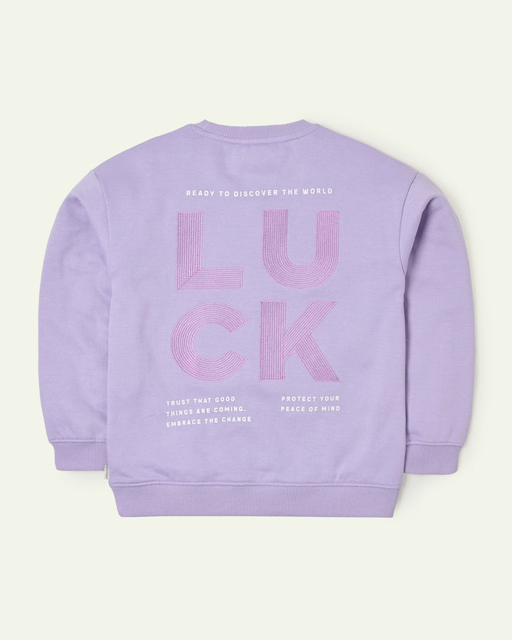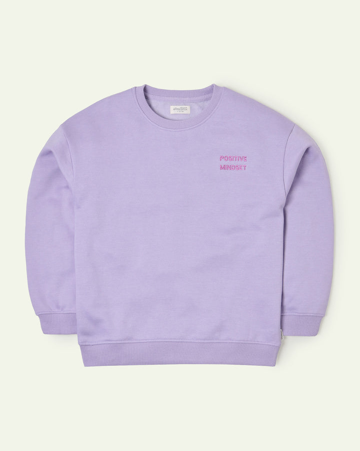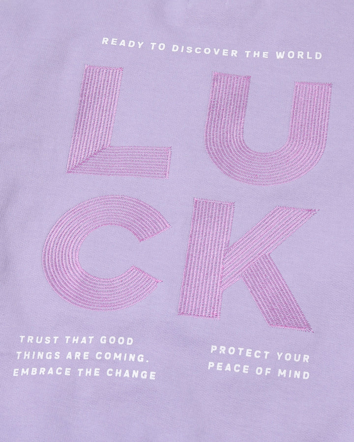 A Lilac hie with fun embroidery details at the back and front for a cool causal look. -Fleece -Embroidered -Graphic Embroidery on Back -Ribbed Neckline & Sleeve Hem -Drop Shoulders -Oversized -Machine Wash Cold