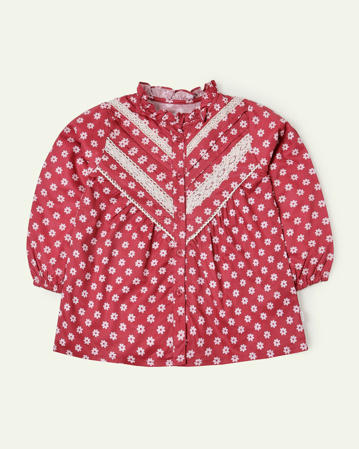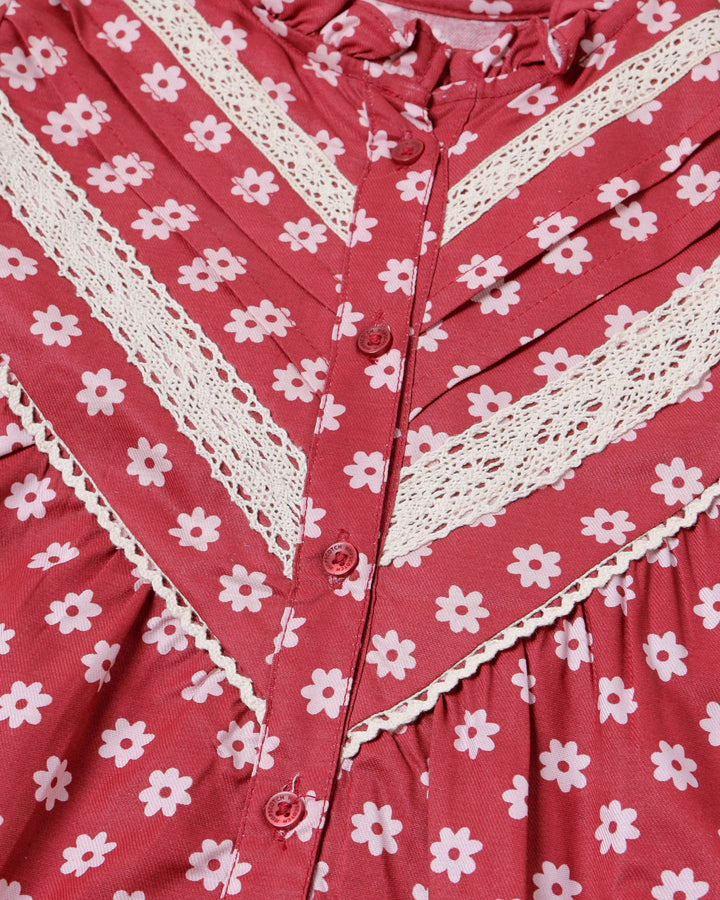 This floral printed lace top in maroon brings a touch of fall charm to her closet. -Cotton/Poly -Pleats -Ruffles -Lace Details -Elastic Sleeve Hem -Front Half Placket Opening -DTM Branded Buttons -Machine Wash Cold