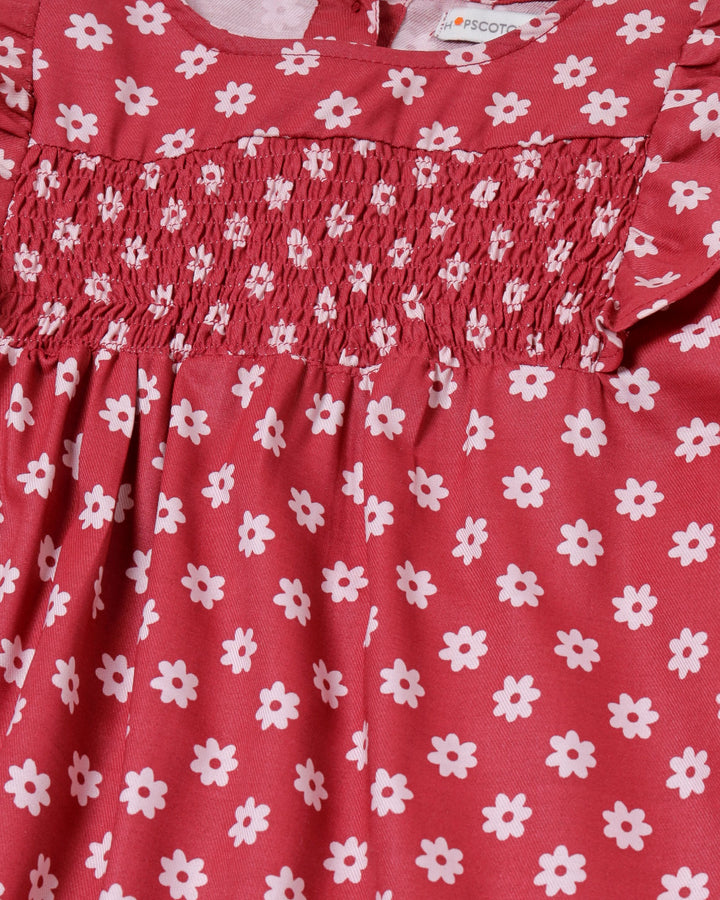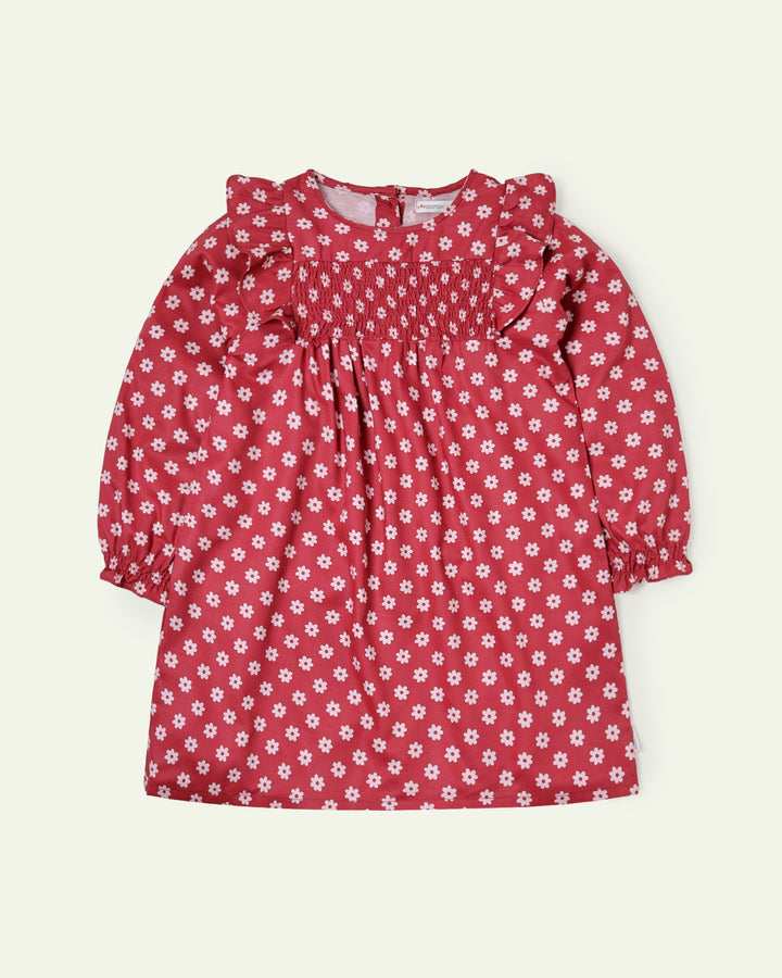 This maroon dress blossoms with floral prints, soft smocking, and dainty lace touches. -Cotton -Smoking on Yoke -Back Placket Neck Opening -DTM Branded Buttons -Elasticated Sleeve Hem -Machine Wash Cold
