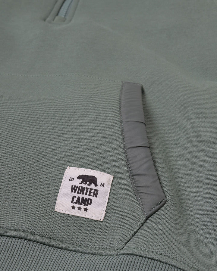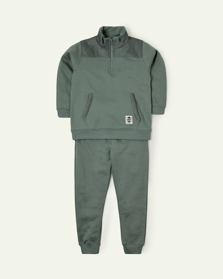 An olive cut and sew mock neck zipper sweatshirt paired with jogger pants in soft fleece and polyester detailing for cozy all-day wear. -Fleece/ Polyester -Sweat Shirt: Cut & Sew, Quarter Zipper Opening, DTM Zipper, Kangaroo Pockets, Twill Patch -Jogger Pants: Elastic Waist, Drawstrings, Cross Pockets, Back Patch Pocket -Machine Wash Cold