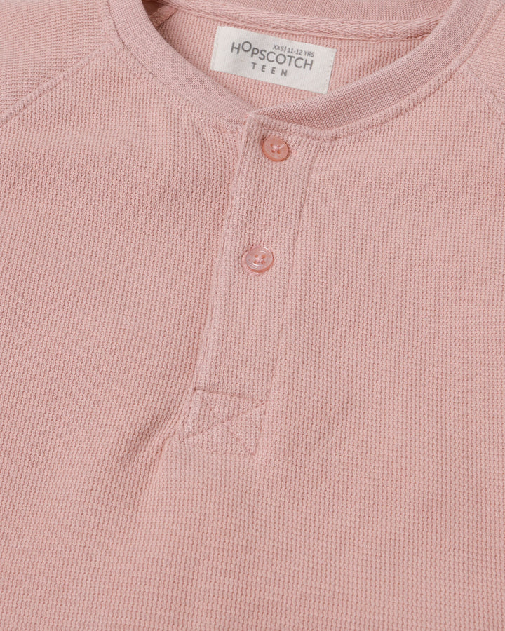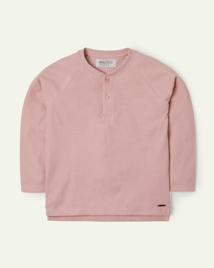 This peach double knit Henley blends softness and durability to keep kids comfy through every adventure. -Double Knit Fabric -Raglan Sleeves -DTM Branded Buttons -Machine Wash Cold