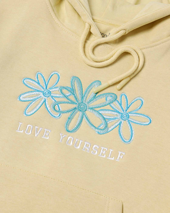 A sunny yellow oversized fleece hoodie adorned with delicate floral embroidery for a cute and cozy everyday look. -Fleece -Embroidered -Kangaroo Pockets -Drawstrings -Oversized Fit -Machine Wash Cold