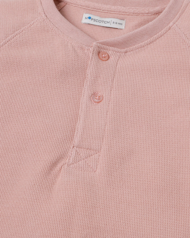 This peach double knit Henley blends softness and durability to keep kids comfy through every adventure. -Double Knit Fabric -Raglan Sleeves -DTM Branded Buttons -Machine Wash Cold