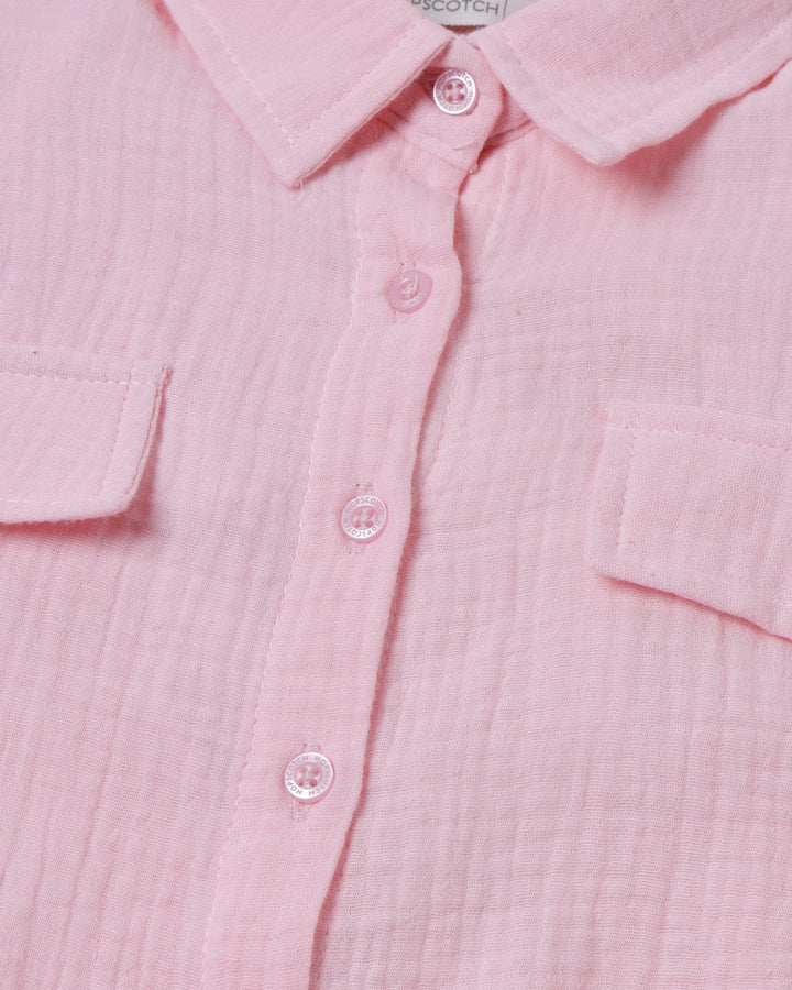 Cute meets cool in this pink crop top with a knotted front and pocket detailing. -Seersucker -Front Placket Opening -DTM Branded Buttons -Turn Up Sleeve Hem -Front Flap Pockets -Front Knot -Machine Wash Cold
