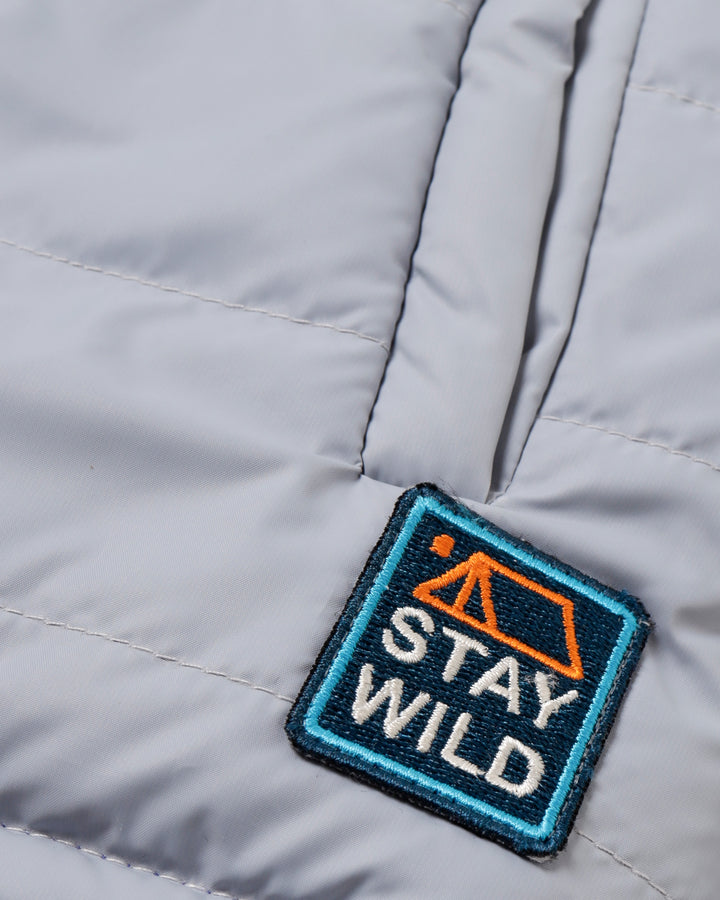 A cozy two-in-one layer, this reversible puffer jacket features grey and blue sides with a fun applique badge. -Polyester -Side Welt Pocket -Embroidered Applique Badge -Double Sided -Dry Clean
