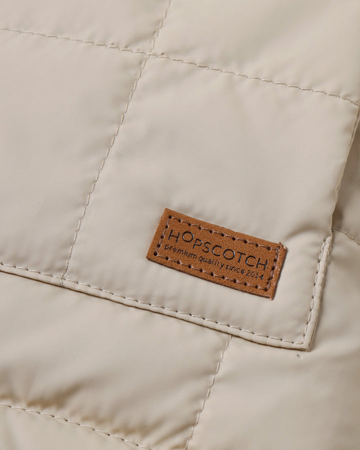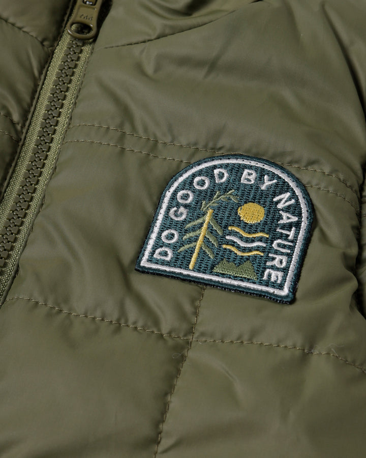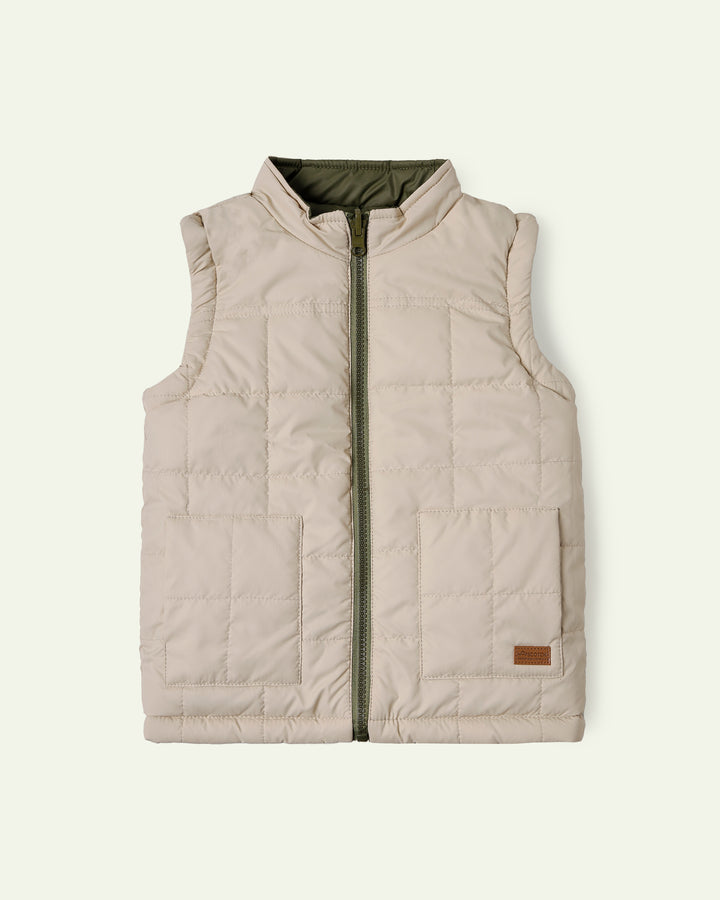 Two looks in one, this reversible sleeveless puffer jacket features olive and beige sides with an applique badge that celebrates nature. -Polyester -DTM Front Zipper -Patch Pockets -Applique Badge -Leather PU Patch -Double Sided -Dry Clean