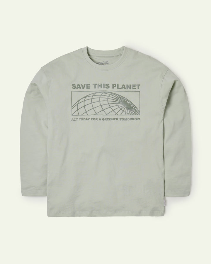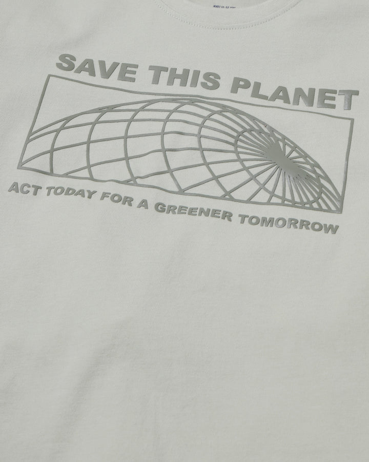 A soft green T-shirt with HD printed Save The Planet artwork that encourages kids to make a difference in style. -Cotton -HD Print -Machine Wash Cold