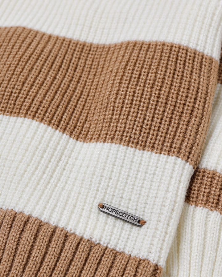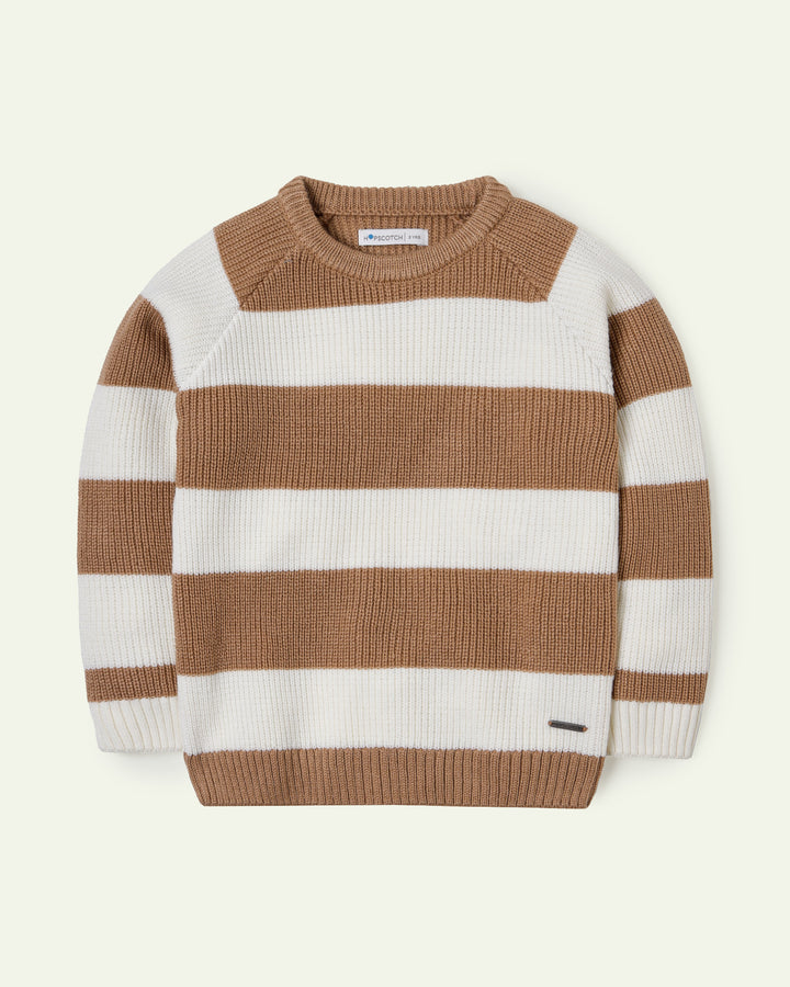 A beige-toned sweater with tan and brown stripes that blends style with comfort. -Acrylic -Crew Neck -Metal Trim Badge -Raglan Sleeves -Machine Wash Cold