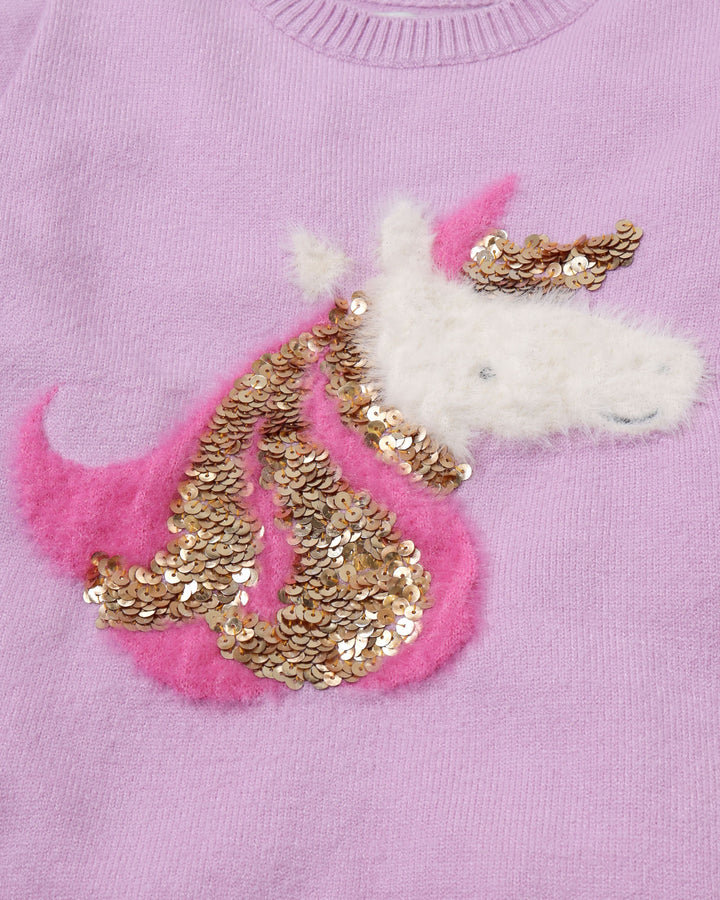 A magical pink sweater with a unicorn design, sparkling sequins, and soft feather yarn details. -Viscose/Nylon/Polyester -Embellished w/ Sequins & Feather yarn -Dry Clean