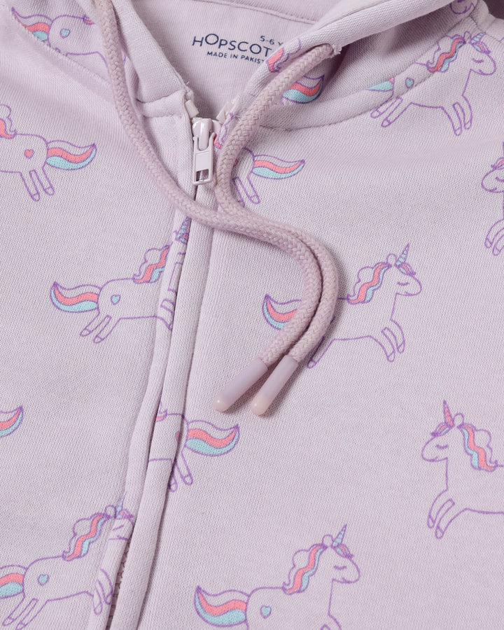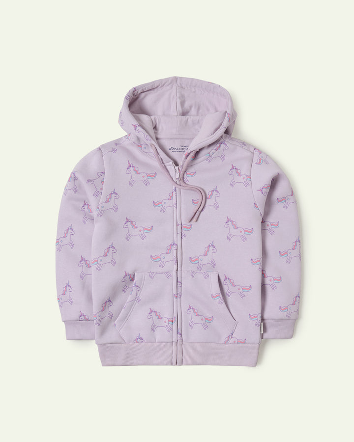 This lilac fleece zipper hoodie for kids with a unicorn print adds the perfect pop of magic to their everyday winter wear. -Fleece -Drawstrings -Front Zipper Opening -DTM Zipper -Split Pockets -Machine Wash Cold