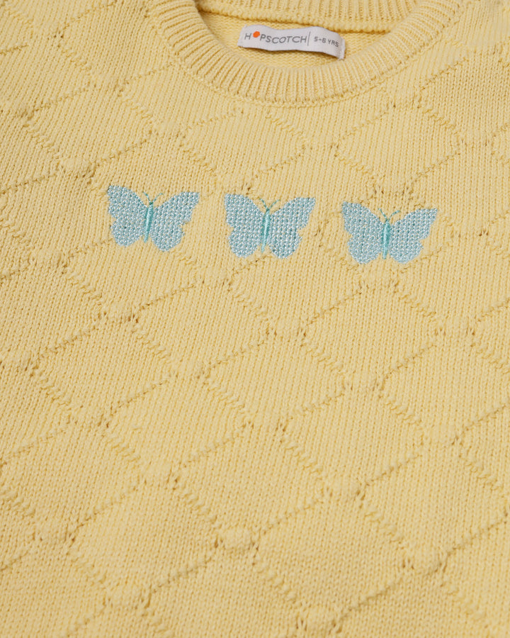 A cozy pop of color, this sweater features charming blue butterflies dancing across the chest. -Acrylic -Embroidered -Machine Wash Cold